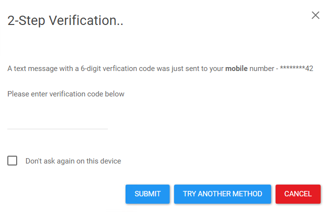 Enter verification code in the designated box and click on Submit. If you open application frequently from current device, then check "Don't ask again on this device" box. Finally, if you do not receive text message or you are not close to your phone then click on "Try Another Method" button. It will send verification code on your registered email.
